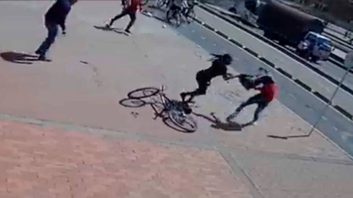 Las cámaras de seguridad del sector captaron la reacción de la mujer que había sido víctima de robo, un ladrón en bicicleta había arrebatado su teléfono celular.