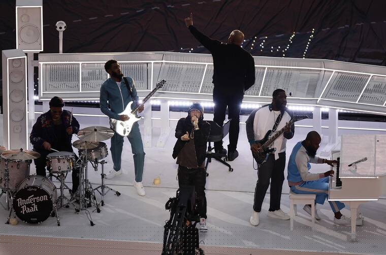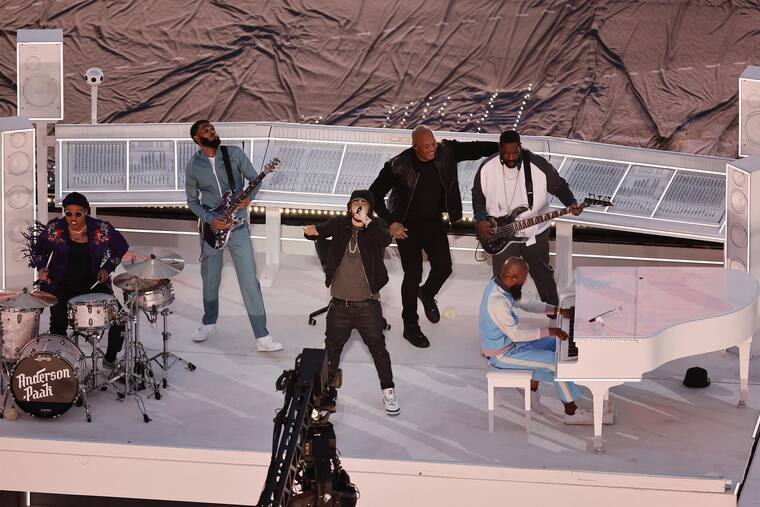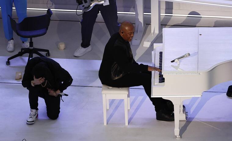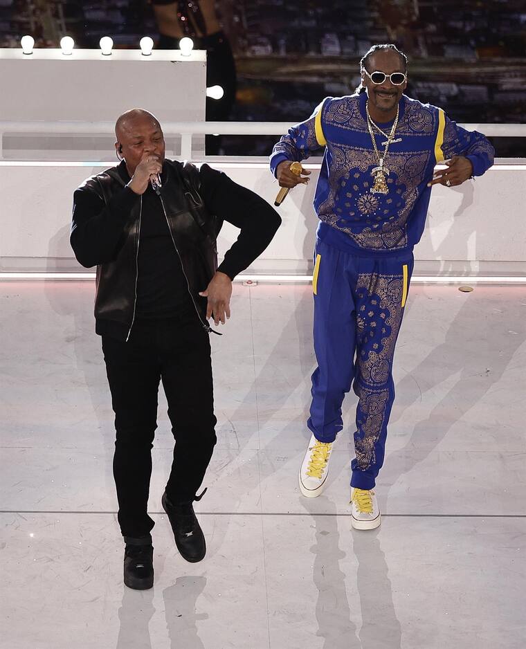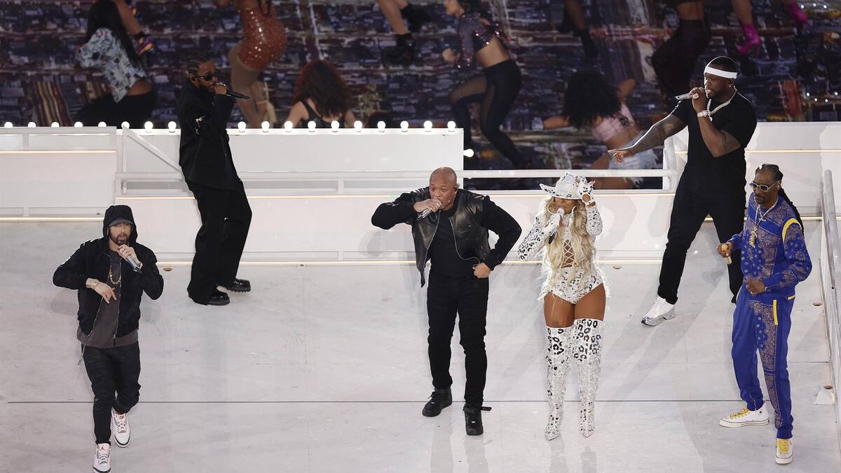 Los cantantes Eminem, Kendrick Lamar, Snoop Dogg, Mary J. Blige y Dr. Dre brillaron en durante la presentación en el SoFi Stadium en Inglewood, California.