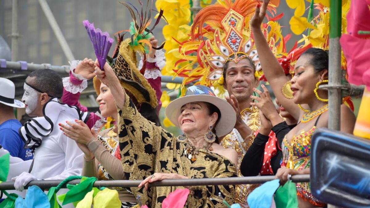 Riendo, bailando y gozando, así se vio a la maestra del folclor y coreógrafa barranquillera, Gloria Peña en su arribo a la Gran Parada de Comparsas de Tradicional Popular y de Fantasías.