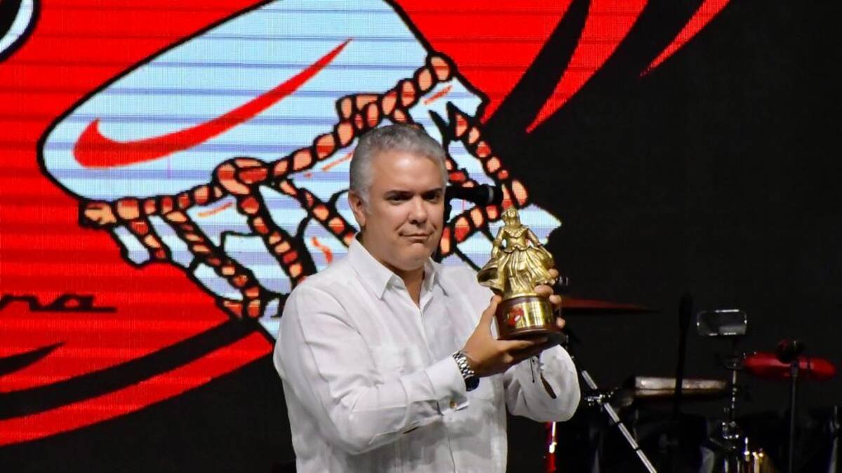 El presidente de la Fundación Festival de la Leyenda Vallenata, le entregó la Estatuilla la pilonera mayor Consuelo Araujonoguera a Duque.