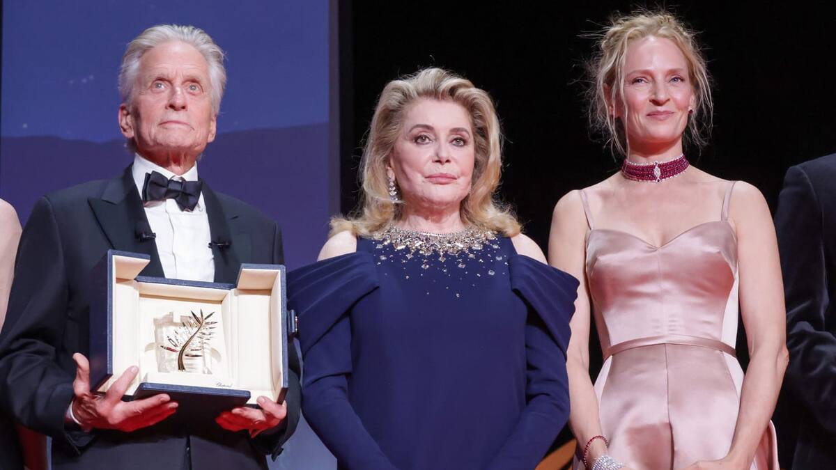 La encargada de entregarle la Palma de Oro de Honor fue la actriz Uma Thurman, quien recordó que ese galardón se entrega a figuras que hayan realizado una contribución excepcional al cine y aseguró que ella no puede pensar en nadie mejor que Michael Douglas, un 'titán' del séptimo arte.