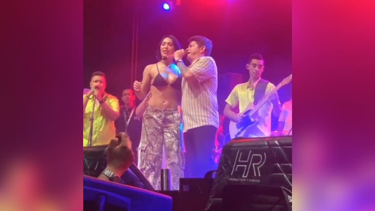 La intérprete de ‘La cachera’ reacciona de inmediato empujando a su colega para apartarlo de ella, con gesto de incomodidad. No obstante, decide continuar con el show y dejar pasar el desagradable momento que la hizo vivir el cantante de ‘Imborrable’.