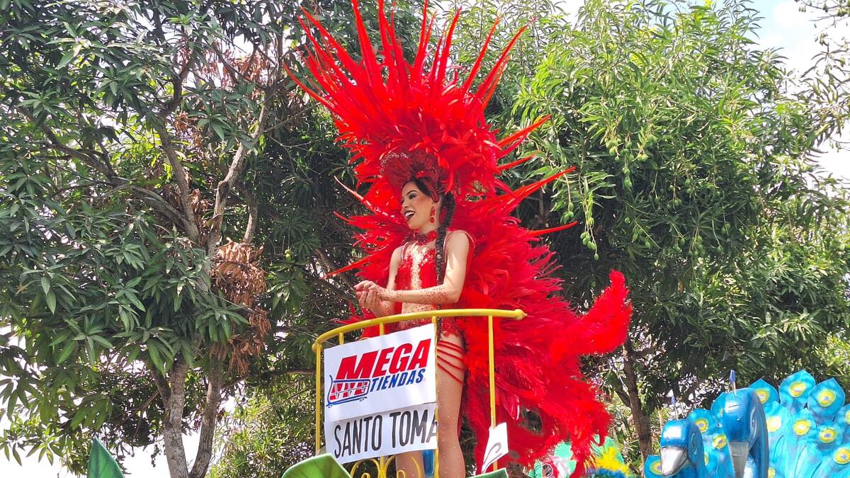 Seguidamente, la reina central de Santo Tomás, Natalia Acosta, inauguró el tradicional desfile con un vestido de plumas rojas y tras ella, uno de los artistas más sonados durante las fechas carnavaleras, Rafa Pérez, quien a ritmo del Dele que dele ha puesto a bailar a los amantes de las carnestolendas.