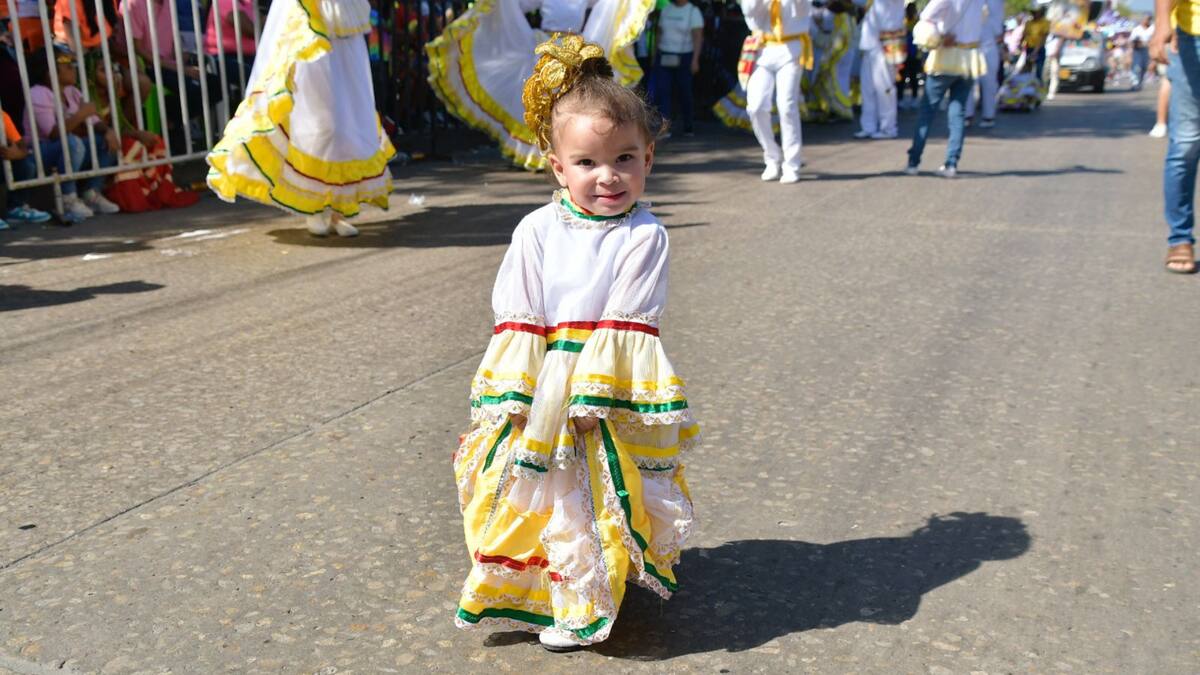 La pequeña de 2 años de edad va bailando con la Cumbiamba Puerta de Oro acompañada de su madre. Los aplausos son para ella.