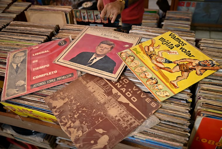 Si bien uno entraría a una tienda de discos para comprar música, ver lo nuevo que hay, adentrarse en ese mundo mágico de las sonoridades del mundo, la realidad es que en Discolombia hay vinilos para todos los gustos y ejemplo de ello son discos de discursos políticos entre los que destacan personalidades como John F. Kennedy, Alfonso López Michelsen, Nacho Vives y hasta un compilado cual reunión de cantantes que agrupa a otros como Belisario Betancur, Alberto Lleras Camargo y más. “Eso era algo que se hacía para que la gente que no iba a la plaza a escuchar el discurso pudiera tenerlo en su casa”, explica León Murcia.