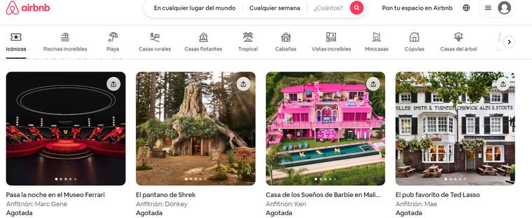 El año pasado, la aplicación lanzó al mercado algunos hospedajes llamativos, como la casa del pantano de Shrek, la de la muñeca Barbie y hasta la posibilidad de pasar la noche en la última tienda Blockbuster, sin embargo todas están agotadas. Para 2024 la plataforma presentó también su campaña Icons, la cual incluye 11 experiencias para viajeros en todo el mundo en eventos que reúne a personajes de la televisión, la música y el entretenimiento.