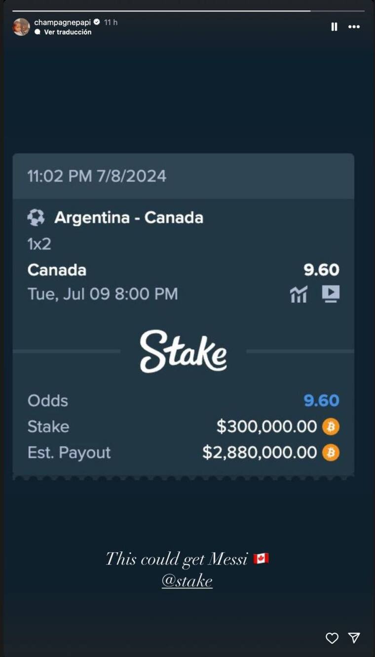 El reconocido cantante canadiense Drake ha captado nuevamente la atención de sus seguidores y los aficionados del fútbol por igual, luego de que se diera a conocer la noticia de que ha apostado la impresionante cantidad de 300 mil dólares a que la selección de Canadá vencerá a la Argentina en la semifinal de la Copa América USA 2024.