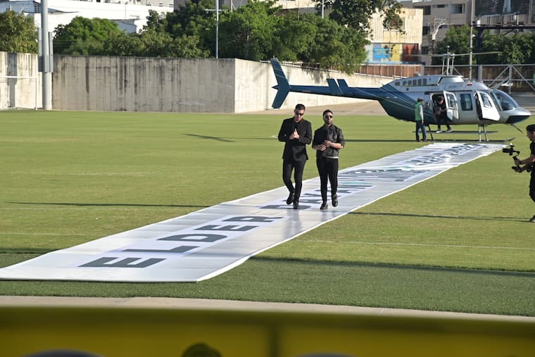Al mejor estilo hollywoodense Elder y Lucas aparecieron en un helicóptero de colores plateado y azul, una entrada que dejó atónitos a todos los periodistas que desde la grada norte del escenario deportivo esperaban a los músicos para conocer detalles de esta nueva producción y lanzamiento.