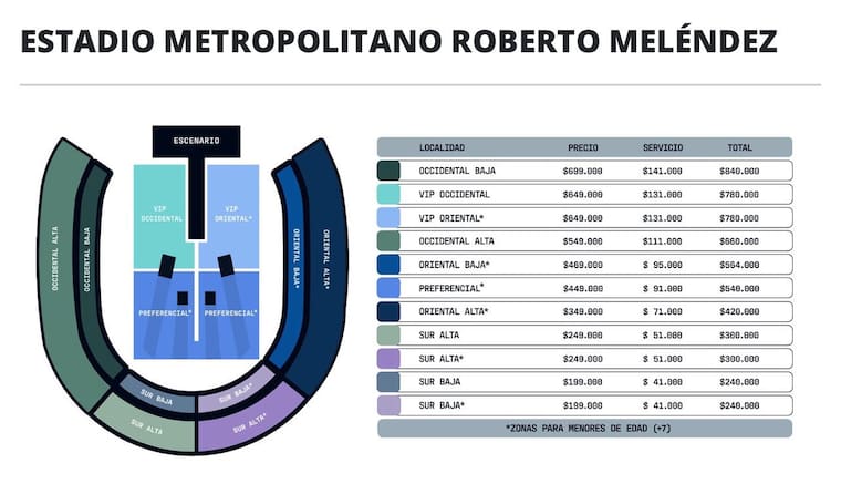 Los fans de Shakira pueden acceder a distintas localidades del estadio Metropolitano para poder ver el show de la artista. La boleta más económica es en sur baja y tiene un costo de 240 mil pesos.