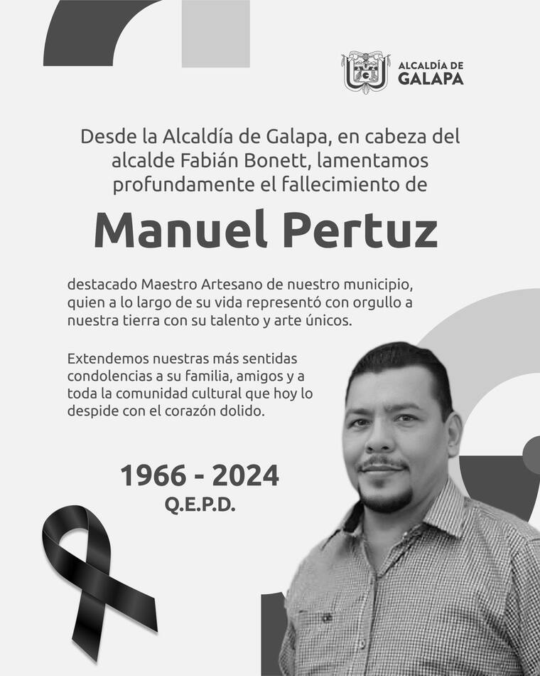 “Hoy, el municipio de Galapa despide a un hombre cuya vida fue un símbolo de dedicación, amor por la cultura y compromiso con el arte. Manuel Pertuz vivirá para siempre en las máscaras que dejó atrás, en las manos de los artesanos que formó y en los colores vibrantes que pintó sobre el rostro del Carnaval; que hoy quedan como baluarte histórico en su taller: Artesanías Toro Miura”, precisa el comunicado de la Alcaldía de Galapa.