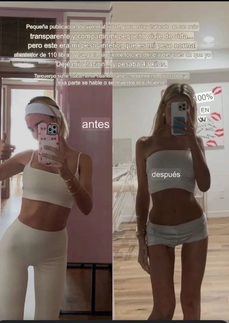 En otra publicación, la creadora de contenido publicó dos fotos que mostraban su antes y después de la relación sentimental. Las imágenes evidenciaban la pérdida de peso que presentó, según dijo, un total de 12 libras.
