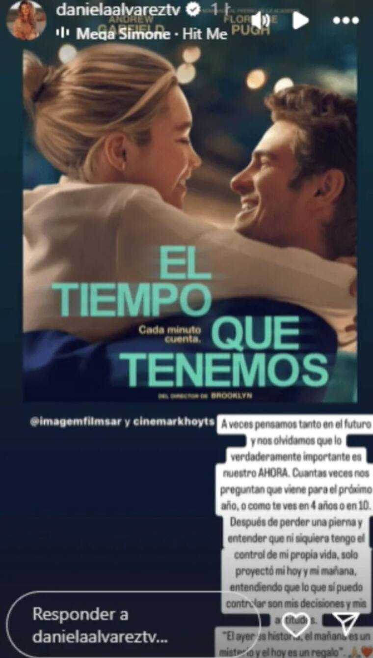 Después de ver la cinta, Daniela Álvarez compartió en sus ‘historias’ de Instagram el póster oficial de ‘El tiempo que tenemos’ y lo acompañó de un mensaje que relaciona a la película con su historia de vida.