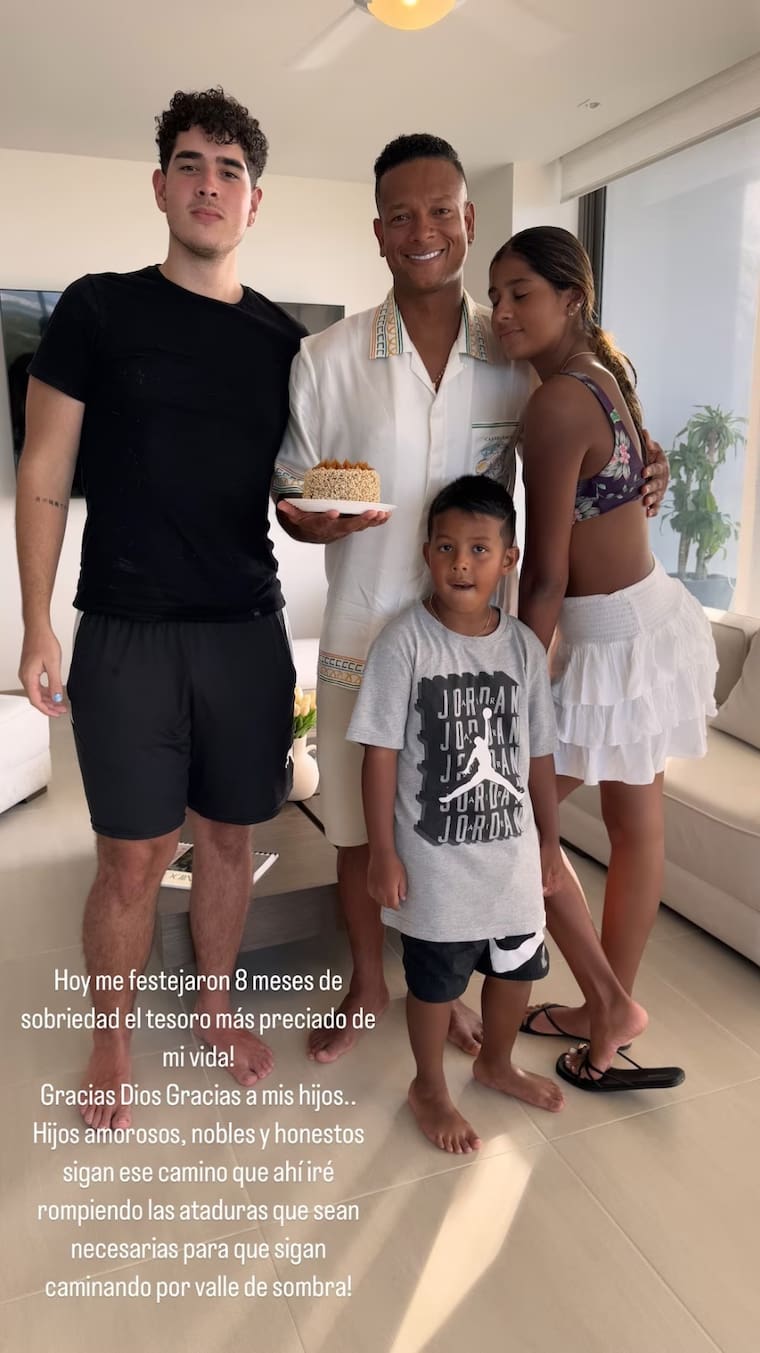 “Hoy me festejaron 8 meses de sobriedad, el tesoro más preciado de mi vida! Gracias Dios, Gracias a mis hijos... Hijos amorosos, nobles y honestos sigan ese camino que ahí iré rompiendo las ataduras que sean necesarias para que sigan caminando por valle de sombra!”, escribió Guarín.