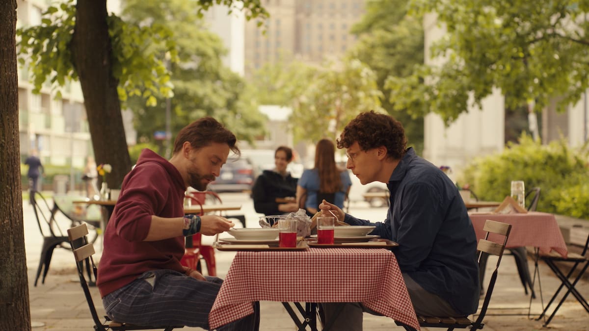 Eisenberg se inspiró tanto en ese primer viaje a Polonia que primero escribió una obra de teatro, The Revisionist, que debutó en el circuito off-Broadway en 2013. En ella, Eisenberg interpretó a otro personaje llamado David, un joven estadounidense que visita a su prima polaca mayor, sobreviviente del Holocausto, encarnada por Vanessa Redgrave. La obra fue un éxito, pero sus intentos de adaptarla a un guion de cine no prosperaron. “Todas mis adaptaciones eran malas”, dice Eisenberg con franqueza. “Y pensé, realmente quiero escribir y ambientar una película en Polonia, poder filmar allí, vivir otra historia en ese lugar. Me tomó unos 15 años conseguir algo bueno, pero finalmente di con esta historia, que es una comedia de compañeros en el marco de un tour por la historia polaca”.
