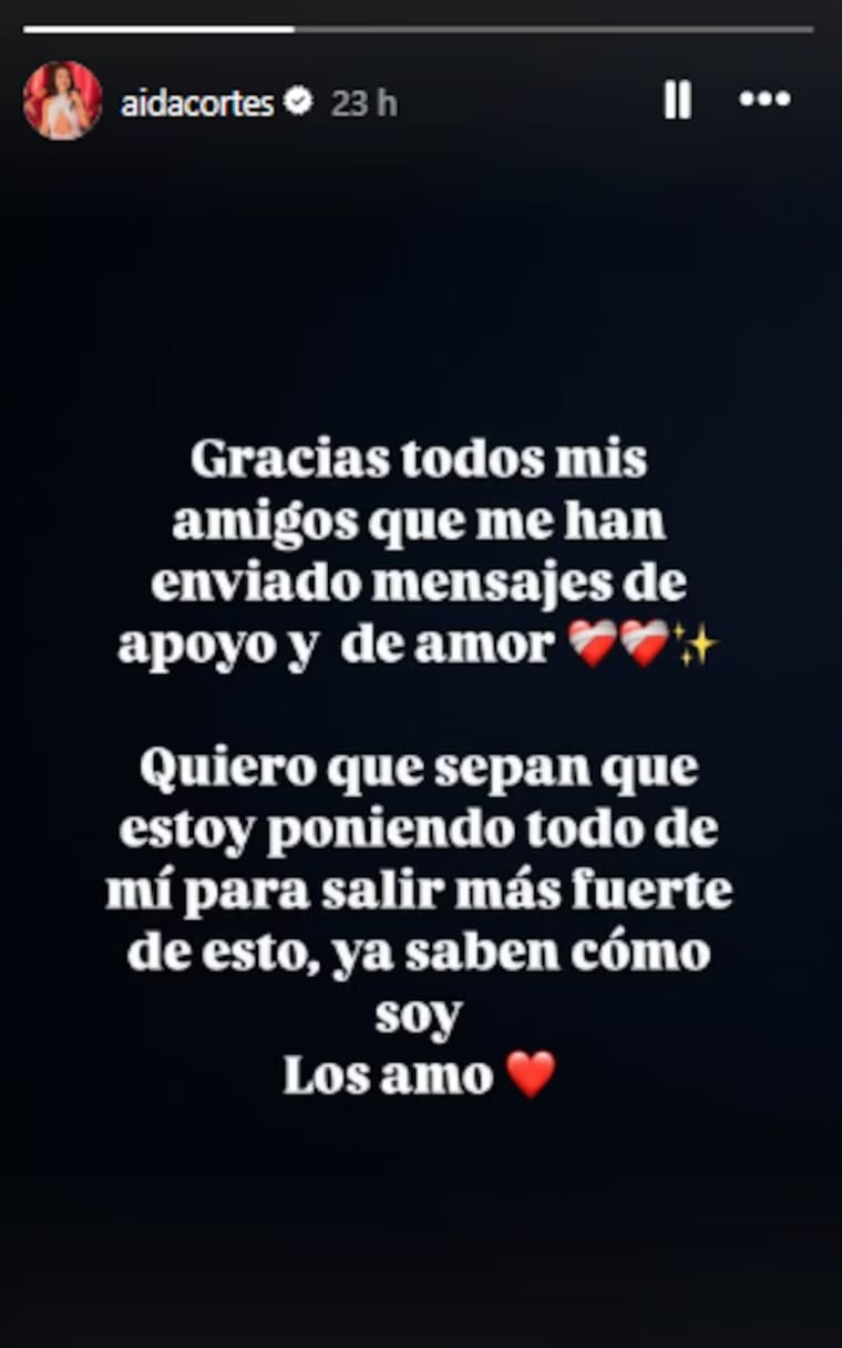 “Gracias a todos mis amigos que me han enviado mensajes de apoyo y de amor. Quiero que sepan que estoy poniendo todo de mí para salir más fuerte de esto, ya saben cómo soy. Los amo”, escribió Aida Cortés en la red social.