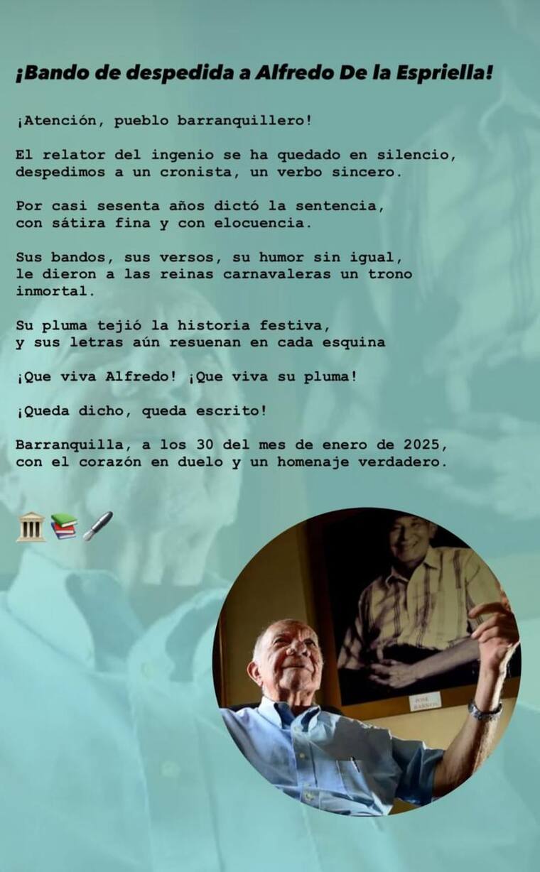 El silencio ha caído sobre la pluma que, por casi seis décadas, narró con sátira y picardía la historia de Barranquilla. Alfredo de la Espriella, el cronista falleció este jueves 30 de enero dejando un gran legado en la memoria cultural de la región. La gestora cultural y periodista Diana Acosta le rindió homenaje con un bando de despedida, una forma simbólica de exaltar la vida de quien, año tras año, puso en palabras la esencia barranquillera.