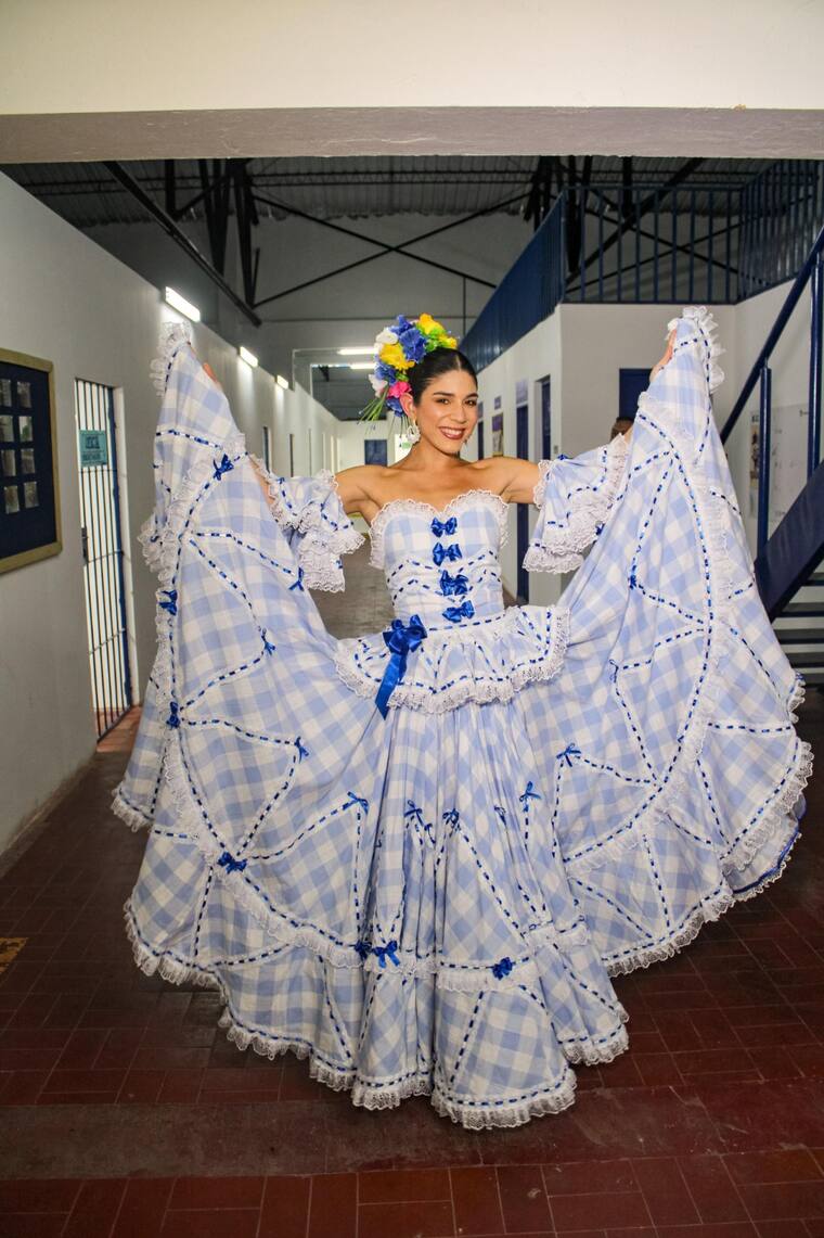 Durante uno de los días de visita a medios en Bogotá, la reina de los bordilleros lució con orgullo la pollera elaborada en el taller de confección de la Industria Penitenciaria.