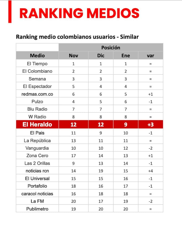 EL HERALDO se encuentra en el lugar número 9 de la lista, por encima de ‘El País’ de Cali, La República, ‘Vanguardia’ de Bucaramanga, Noticias RCN, Portafolio, ‘El Universal’ de Cartagena, Caracol Noticias, La FM, entre otros medios.