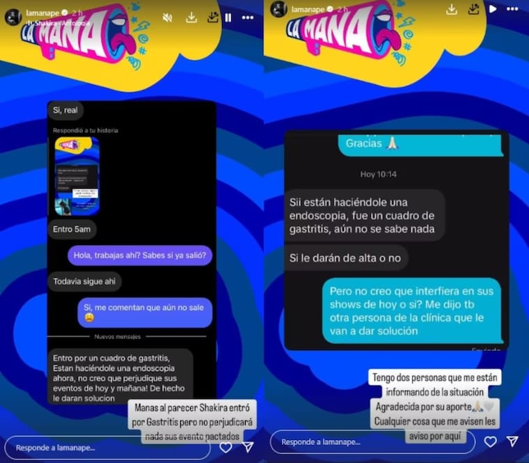 El medio Infobae, citando a la generadora de contenido, aseguró que la artista ingresó en horas de la madrugada, al parecer, por un fuerte cuadro de gastritis. Inicialmente, la ‘influencer’, compartió una conversación, en la que le informaban sobre la llegada de la cantante al centro médico, y luego hizo otra publicación en la que afirma que Shakira sería sometida a una endoscopia.