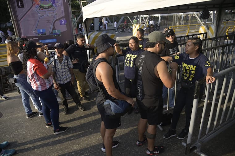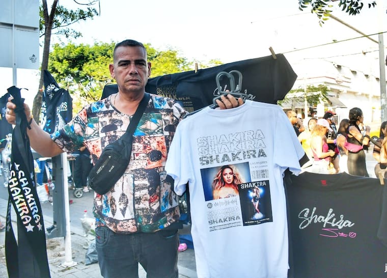 Javier Vera y su compañero, ambos de Maracaibo, llegaron a Barranquilla desde Perú con la esperanza de vender camisetas y gorras conmemorativas del ‘Las Mujeres Ya No Lloran World Tour’. Para ellos, seguir la gira de Shakira es una oportunidad de negocio única.