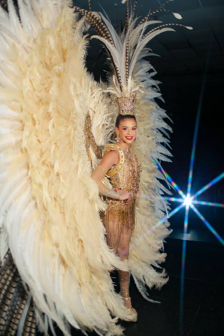 Complementan la obra, una estructura de plumas de gallo, avestruz y faisán que se incorporan la dimensión y la pureza de nuestra tradición. De ahí que este diseño represente la expresión cultural que el Carnaval encarna, un medio por el cual la tradición y la modernidad dialogan en un mismo lenguaje de brillo y movimiento. A ello se une el componente sentimental de lo que ha sido el reinado de Tati que llega a una noche resplandeciente para entregarse a todos los barranquilleros.
