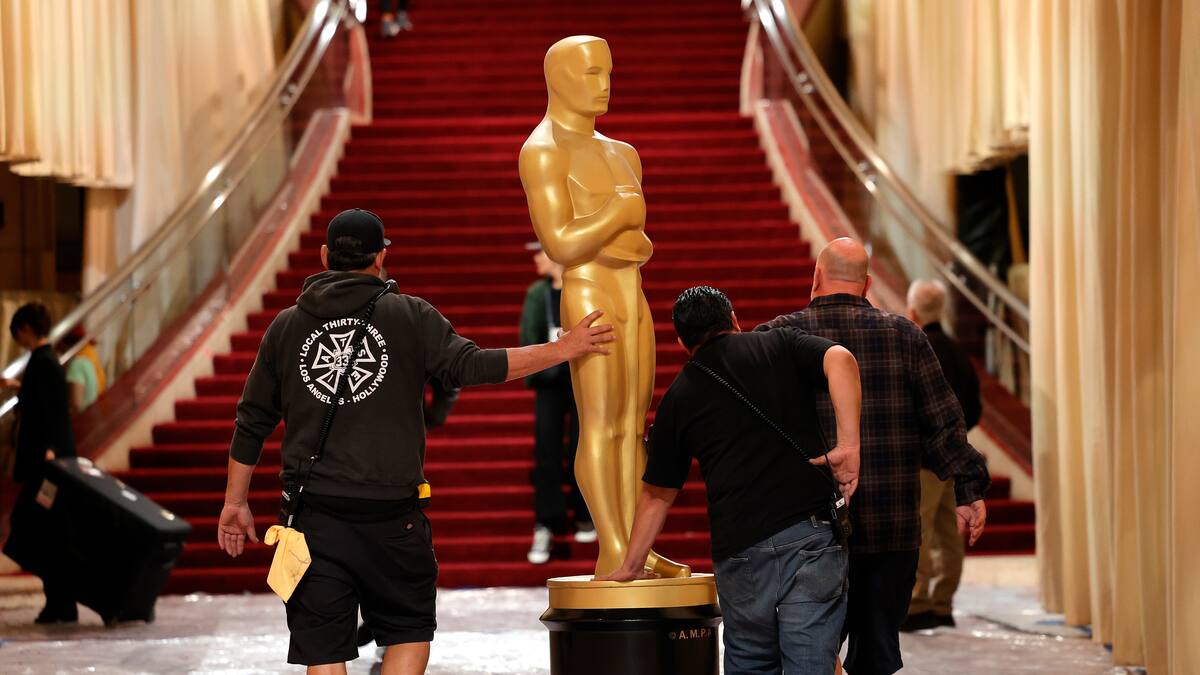 Centenares de técnicos y otros empleados que trabajan en la organización de los Óscar ultiman, escaleras arriba, escaleras abajo, los retoques en las cortinas y el decorado, con las míticas estatuas de los Óscar imponiendo presencia en cada esquina.