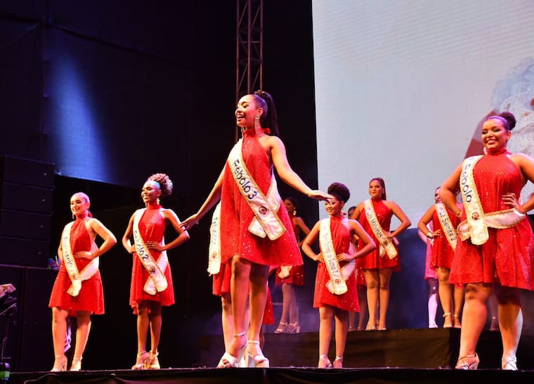 Luciendo vestidos rojos de lentejuelas, aparecen las 25 concursantes a la Corona de la reina popular 2025.