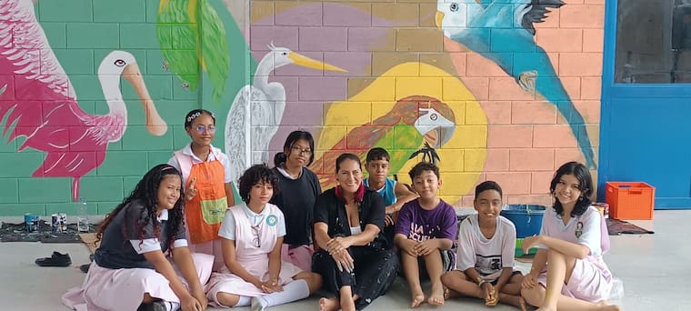 Tras finalizar su intervención en Barranquilla, la artista se trasladó a Cartagena, donde realizó otro mural en el Colegio Villas de Aranjuez de la Fundación Pies Descalzos. Para este proyecto, se inspiró en las aves endémicas de Bolívar, visitando el aviario de Barú para tomar referencias. Entre las especies representadas en su obra están la María Mulata, la garza blanca, el pelícano y los periquitos.