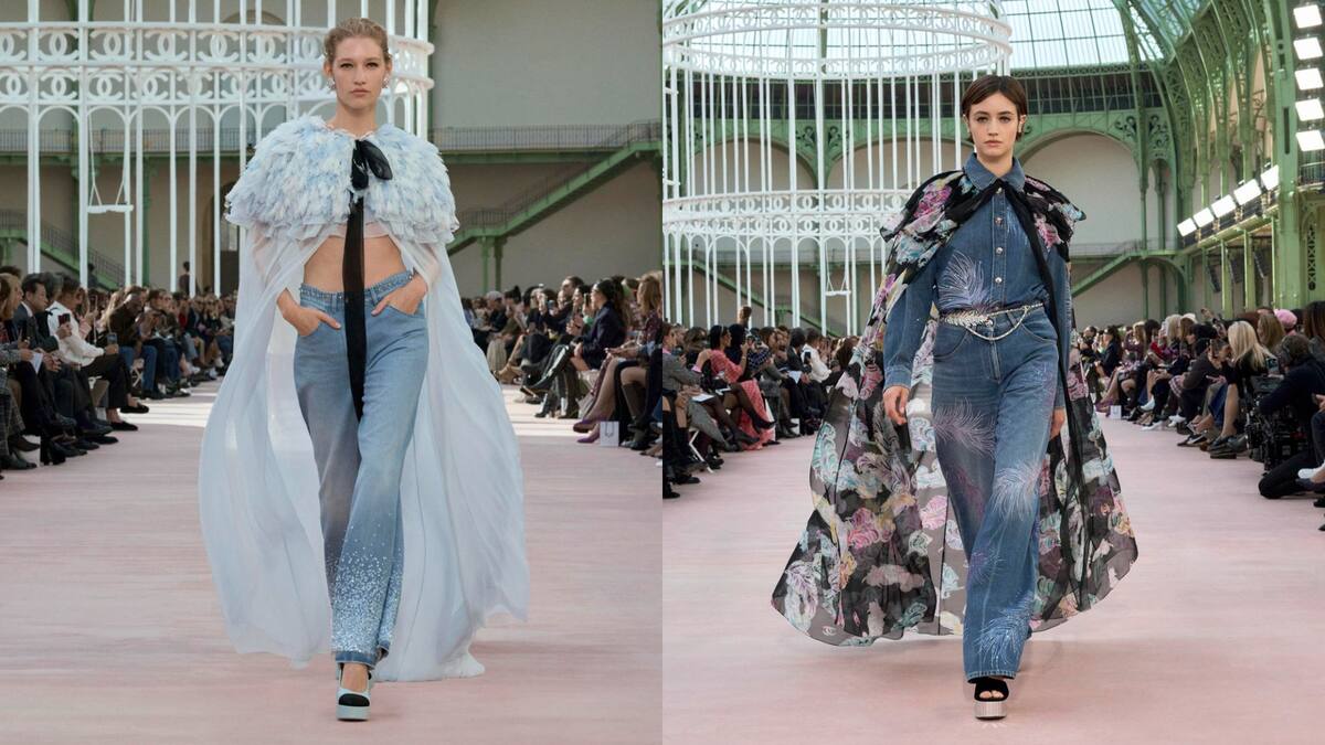 Justo dos años antes, Jean Paul Gaultier exhibió sobre la pasarela de la alta costura parisina una colección completa en denim en la que destacaba un vestido largo, con escote palabra de honor y corte sirena, con plumas de avestruz en azul y blanco, puso en evidencia que el tejido había evolucionado hasta el punto de sofisticarse.