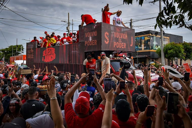 El recorrido lo comandó Silvestre y Juancho trepados en un camión que en todo el frente decía “Volvió el poder”, ambos saludaban al pueblo mientras lanzaban suéteres rojos al pueblo que enloquecía.