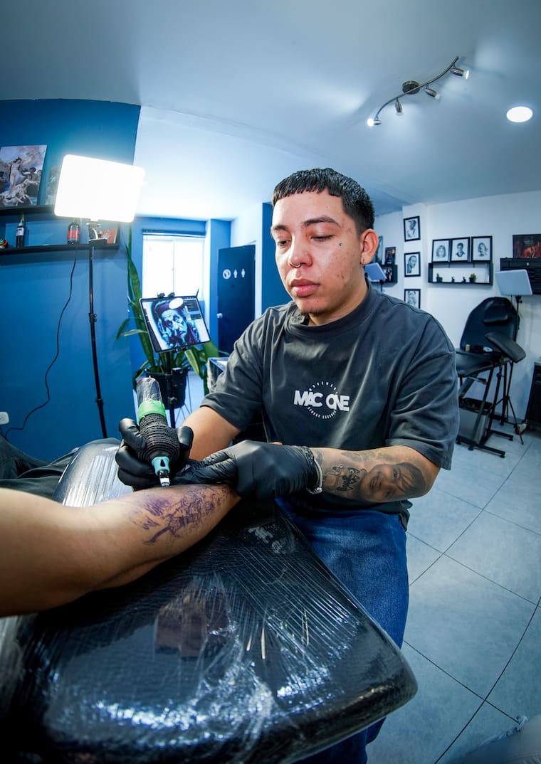 Michael Villamizar, nacido en Barranquilla y conocido en el oficio como ‘Adicto a la Tinta’, cuenta con 13 años realizando tatuajes realistas que conectan con su clientela. Su historia —como de alguna forma era de esperarse— está enmarcada por la resistencia de su familia para que él tatúe y haga este oficio parte central de su existencia y una pasión en su diario vivir, con la que se sostiene económicamente.