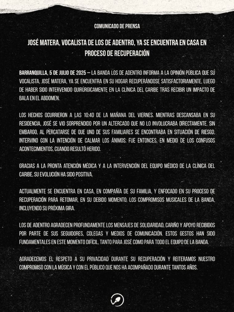 Los de Adentro agradecieron profundamente los mensajes de solidaridad, cariño y apoyo recibidos por parte de sus seguidores, colegas y medios de comunicación. “Estos gestos han sido fundamentales en este momento difícil, tanto para José como para todo el equipo de la banda”.