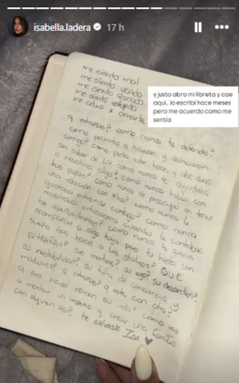 En la imagen, publicada en las redes sociales de la influencer, se va una libreta abierta con un extenso mensaje escrito en ella, compuesto por varias preguntas y afirmaciones como: “me siento mal, me siento usada, me siento abusada, me siento estúpida, me odio x amarte”.