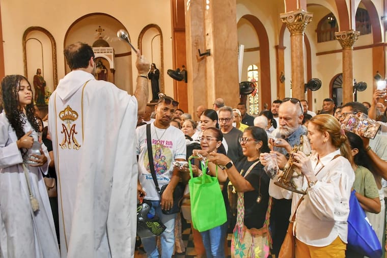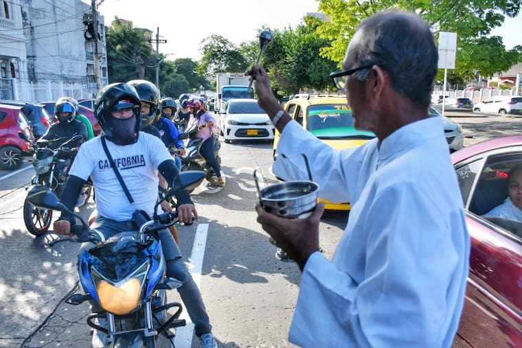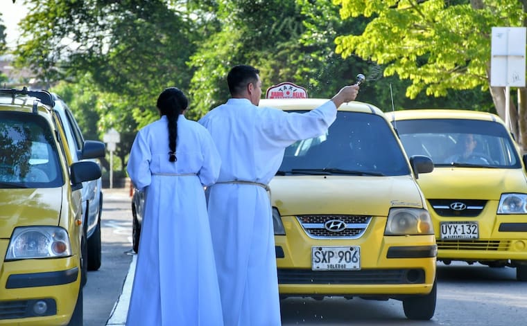 En la entrada del templo, se veían taxis, buses, motos. Uno a uno, los vehículos pasaban para ser bendecidos por el padre Juan David Rendón, mientras los conductores bajaban la cabeza, hacían la señal de la cruz y mostraban sus escapularios.