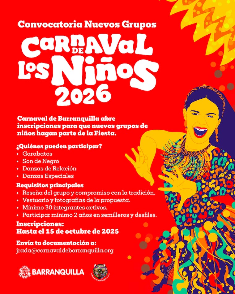 Para mayor información e inscripciones, los interesados deben ingresar a página web oficial de Carnaval de Barranquilla, sección convocatorias, escoja la opción: Convocatoria de Inscripción de nuevos grupos, Carnaval de los Niños 2026 y descargue el formulario con la información.