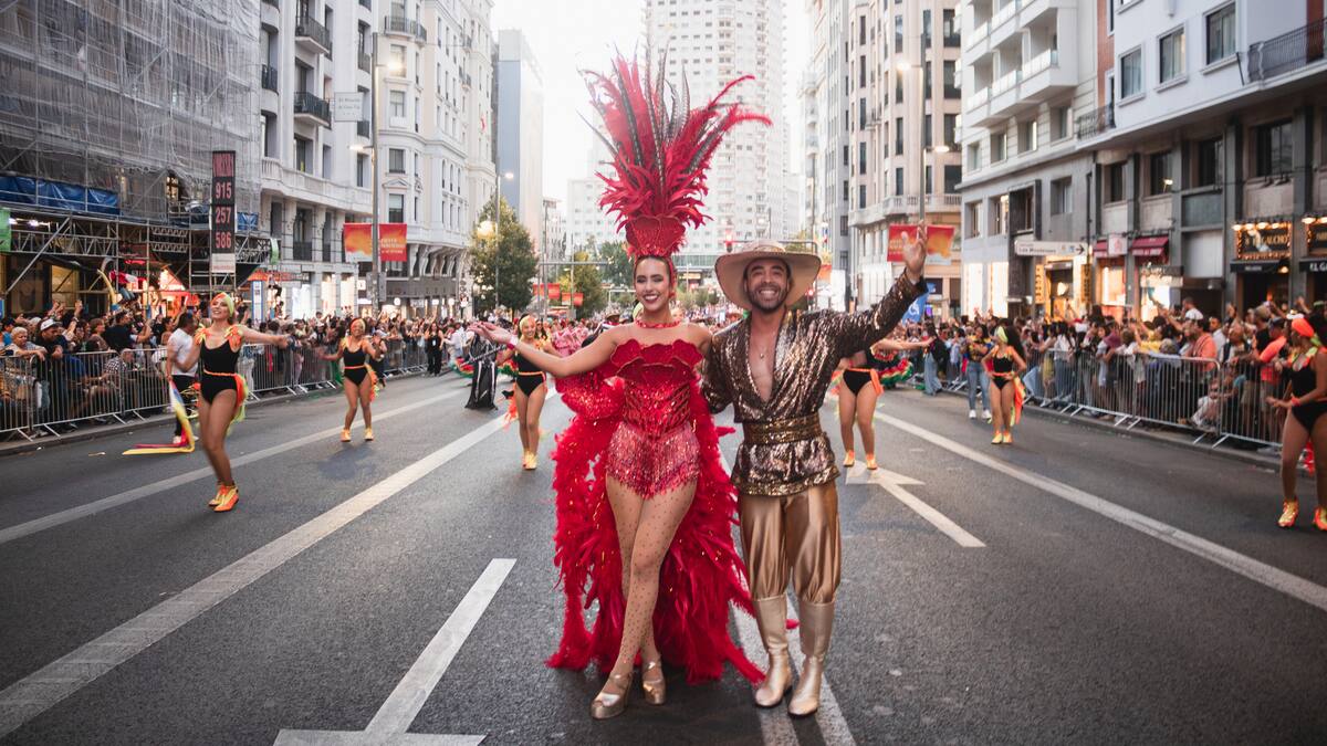 Ambos encabezaron el bloque folclórico de Colombia con el grupo ‘Nativos de Macondo’, una agrupación con más de 30 años de historia en Madrid que llenó de ritmo la Gran Vía al son de la cumbia, el garabato y mapalé.
