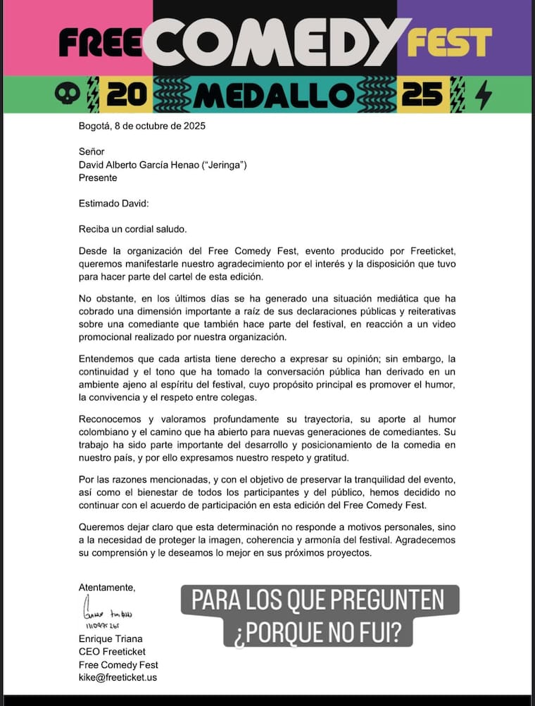 “Entendemos que cada artista tiene derecho a expresar su opinión; sin embargo, la continuidad y el tono que ha tomado la conversación pública han derivado en un ambiente ajeno al espíritu del festival, cuyo propósito principal es promover el humor, la convivencia y el respeto entre colegas”, comenzaron diciendo en una carta que le fue enviada al paisa.