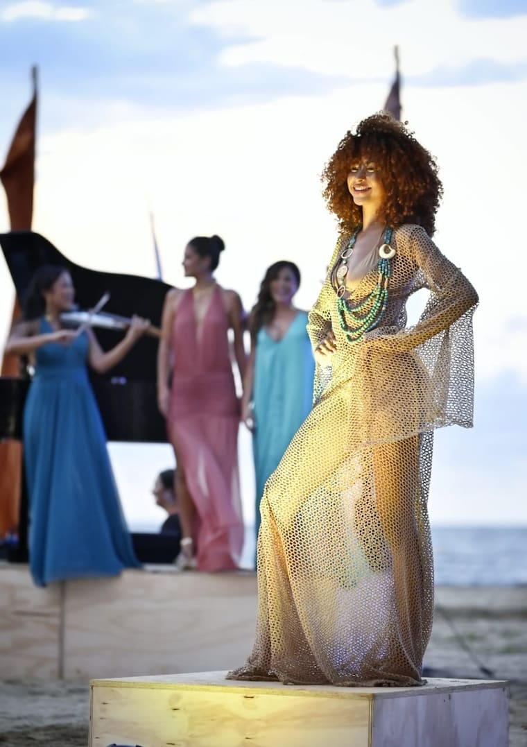 Para la diseñadora de modas, son puntadas que evocan sus raíces, añoranzas, fortalezas, valentía y libertad. Una vitrina que hizo juego con el ambiente tropical, de playa, brisa y mar en el recuperado espacio de Puerto Mocho.