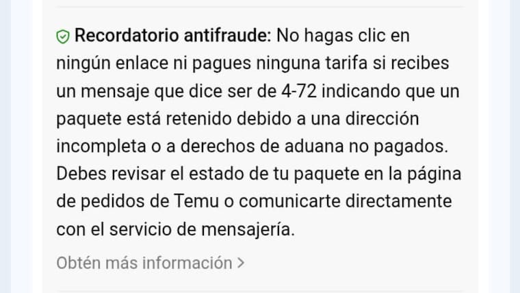 En ese mensaje le adjuntan un link en el cual ingresa y le roban información bancaria. “Recordatorio antifraude: no haga clic en ningún enlace ni pague ninguna tarifa si recibe un mensaje que dice ser 4-72 indicando que su paquete está retenido porque la información de su dirección está incompleta o a derechos de aduana no pagados”, escribió Temu.