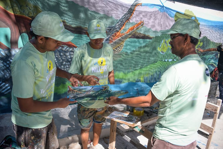 “Llevo toda una vida pintando. Aquí hemos hecho de todo: los letreros para los restaurantes, los nombres de las embarcaciones, las matrículas de las lanchas, la publicidad de los locales. Esto es lo mío y lo de mi familia”, afirma mientras retoca la figura de un caimán sobre el muro.