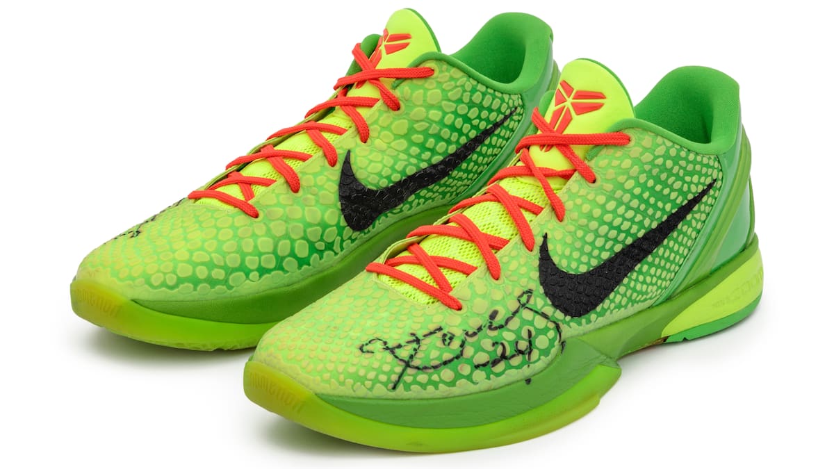 Las icónicas zapatillas Nike Kobe 6 ‘Grinch’, que empleó Kobe Bryant en el partido de Navidad de 2010 contra los Miami Heat de LeBron James, fueron puestas a subasta por un precio mínimo de 10 millones de dólares por la plataforma de comercio Joopiter, propiedad del artista Pharrell Williams.