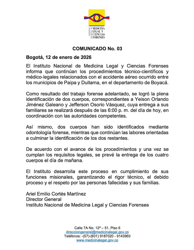 Medicina Legal indicó además que sigue avanzando en los “procedimientos técnico-científicos y médico-legales” para identificar a los otros cuatro cuerpos, que serán entregados este 13 de enero.
