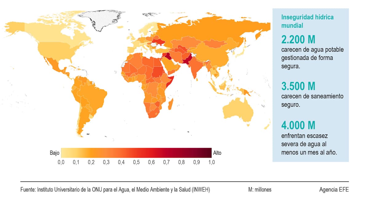 El informe señaló que las regiones en la peor situación son el Oriente Medio, el Norte de África, partes del sur de Asia y el suroeste de Estados Unidos, donde el río Colorado y sus embalses “se han convertido en símbolos de un agua prometida en exceso”.