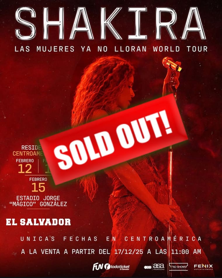 Shakira se presentará en El Salvador en el Estadio Jorge “Mágico” González de San Salvador el 7, 8, 12, 14 y 15 de febrero de 2026.