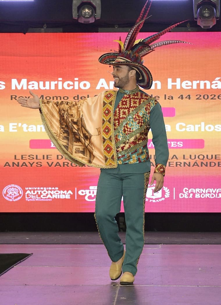 Las muestras no pararon, pues Luis Mauricio Aragón, Rey Momo del Carnaval de la 44 con el vestuario: Tríada E’ tambó que lucirá para la Gran Parada de Carlos Franco. Fue diseñado por Leslie de la Hoz, Daniela Luque, Anays Vargas y Juliana Hernandez.