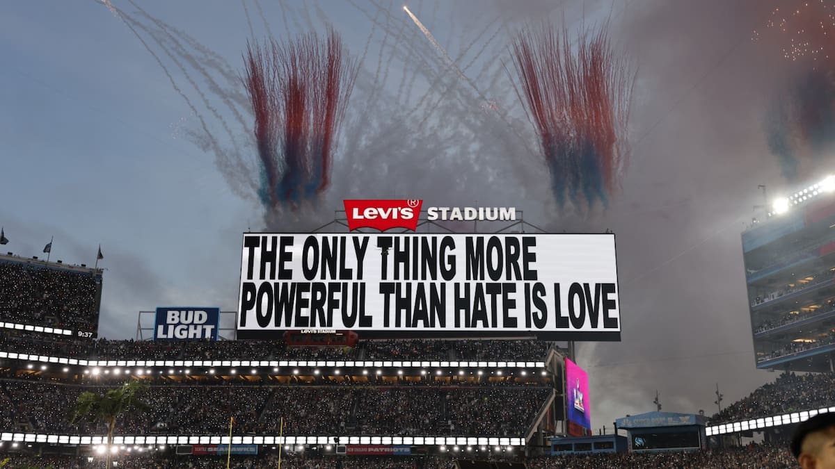 En el fondo, en una pantalla gigante del Levi’s Stadium, en Santa Clara, California, relució un fuerte mensaje que Bad Bunny ya había dicho en días pasados cuando recibió el Grammy: “Lo único más poderoso que el odio es el amor”.