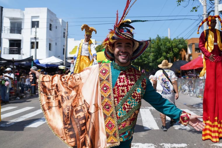A su lado, el Rey Momo Luis Mauricio Aragón lució “Tríada e’ Tambó”, un atuendo que exaltó la cumbia como el gran punto de encuentro de las tres raíces que sostienen la identidad del Caribe colombiano: indígena, africana y española.