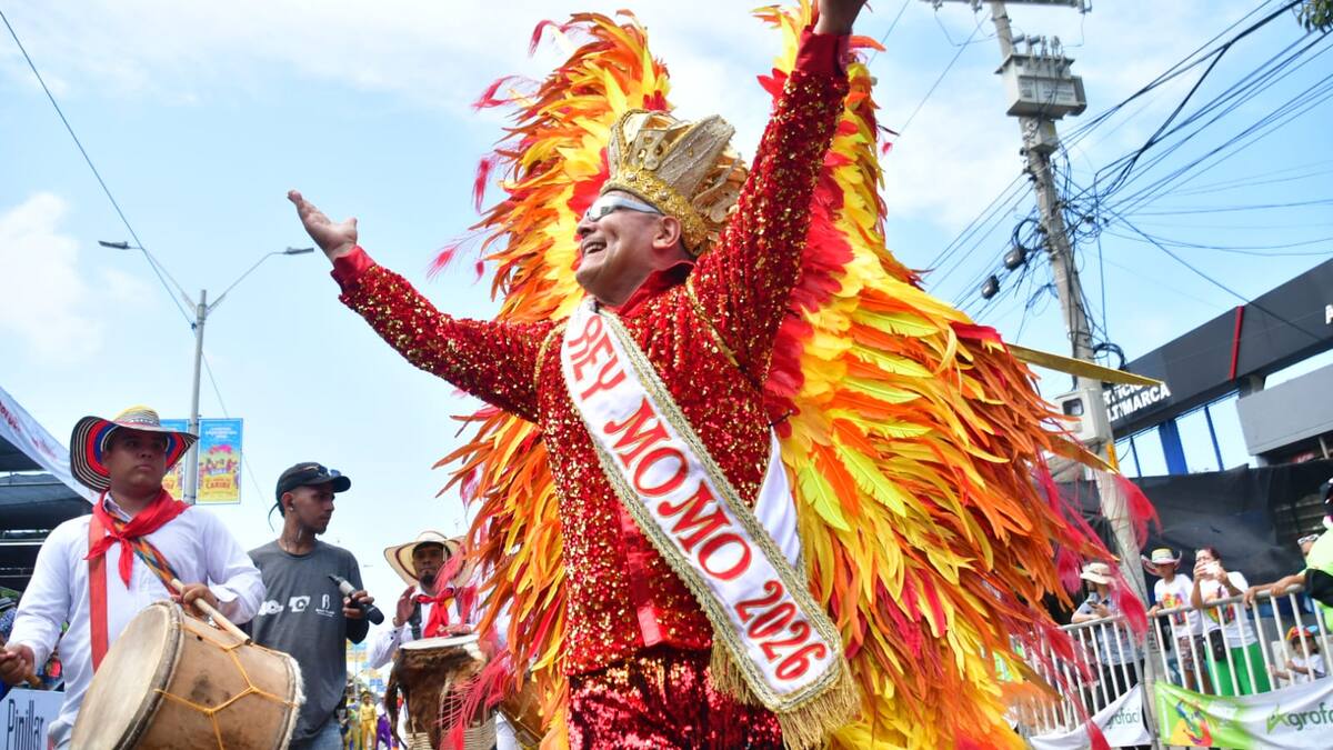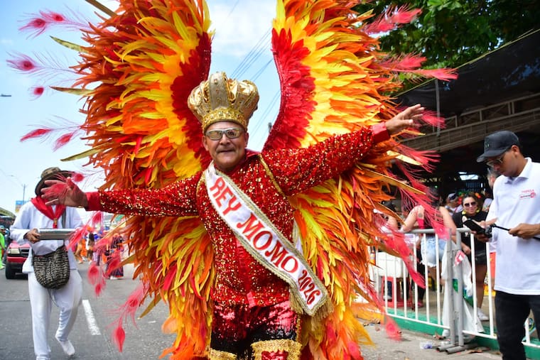 Con la fuerza simbólica de un ave fénix que resurge entre fuego y tamboras, el rey Momo Adolfo Maury se presentó en la Gran Parada de Comparsas del Carnaval de Barranquilla 2026 luciendo un traje que palpita historia y tradición: ‘El Renacer del Congo’.