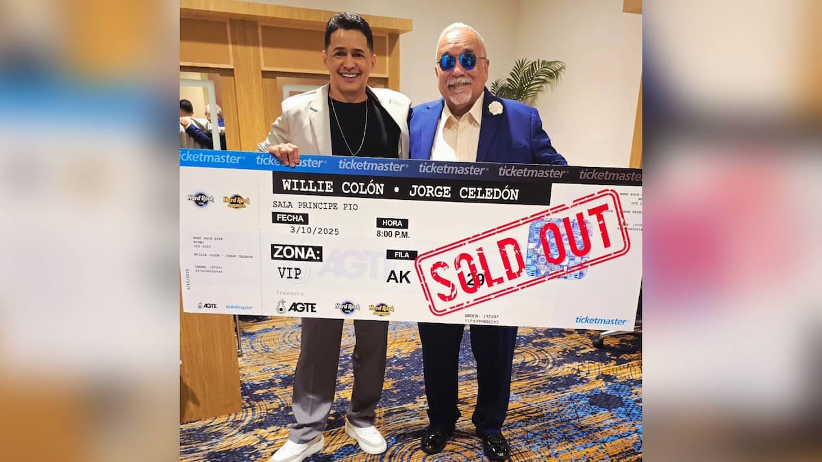 Al final de cuatro horas de concierto, Willie Colón y Jorge Celedón se reunieron en el camerino para estrechar ese abrazo de hermandad y triunfo, posando para la foto histórica con la pancarta de sold out.