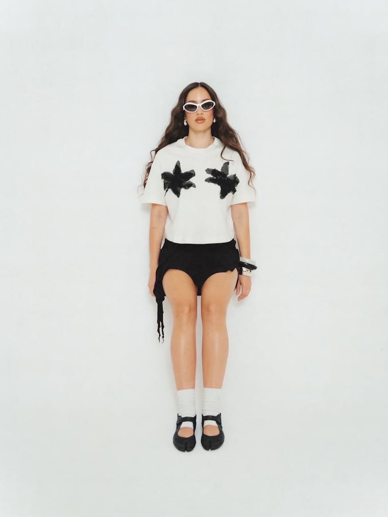 La línea incorpora camisetas gráficas de siluetas relajadas, tops ajustados con acabados brillantes, faldas dinámicas y chaquetas ligeras que juegan con transparencias y superposiciones. También se incluyen vestidos cortos y piezas híbridas que permiten construir looks adaptables tanto a escenarios musicales como a contextos cotidianos.
